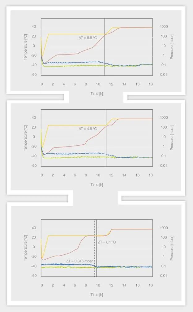 上圖所示為壓差為 0.05 mbar 的結(jié)果,中間圖為 0.03 mbar,底圖為 0.025 mbar 作為終點標準。在達到終點標準之前,壓差至少保持 60 分鐘。隔板溫度用黃線表示,樣品溫度用紅線表示,干燥箱壓力用綠線表示,皮拉尼壓力計在初級干燥(白色陰影)和二級干燥(灰色陰影)上用藍線表示。同時顯示達到壓力(黑線)和溫度終點標準(黑色虛線)的時間,以及該點相應的溫度和壓力差。