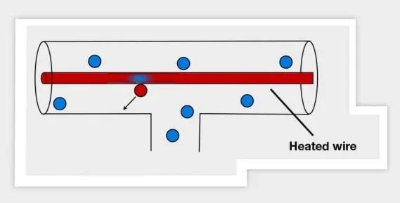 該技術(shù)使用兩種不同的壓力計,一個皮拉尼傳感器和一個電容壓力計。皮拉尼傳感器的工作原理是氣體的熱導率隨壓力變化。壓力計用一根細導線懸掛在氣體中,用電流加熱來測量壓力。在高壓下,由于周圍氣體分子與金屬絲的高碰撞率,金屬絲將熱能損失給氣體。這一原理如下圖所示。