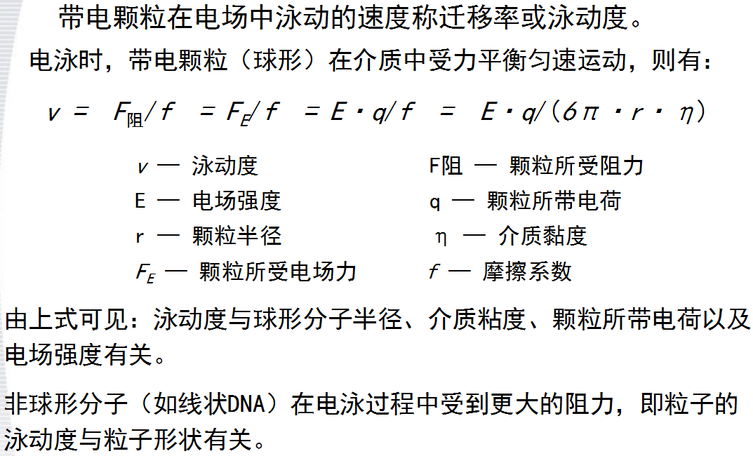 電泳是帶電顆粒在電場作用下,向著與其電荷相反的電極移動的現(xiàn)象。 在一定pH條件下,每一種分子都具有特定的電荷(種類和數(shù)量)、大小和形狀,在一定時間內(nèi)它們在相同電場中泳動速度不同,各自集中到特定的位置上而形成緊密的泳動帶。這就是帶電粒子可以用電泳技術進行分離、分析和鑒定的基本原理。
